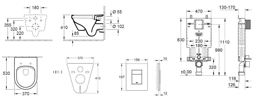 Conjunto de módulo de instalación en pared, inodoro y asiento Villeroy & Boch, botones Skate Cosmopolitan, cromo