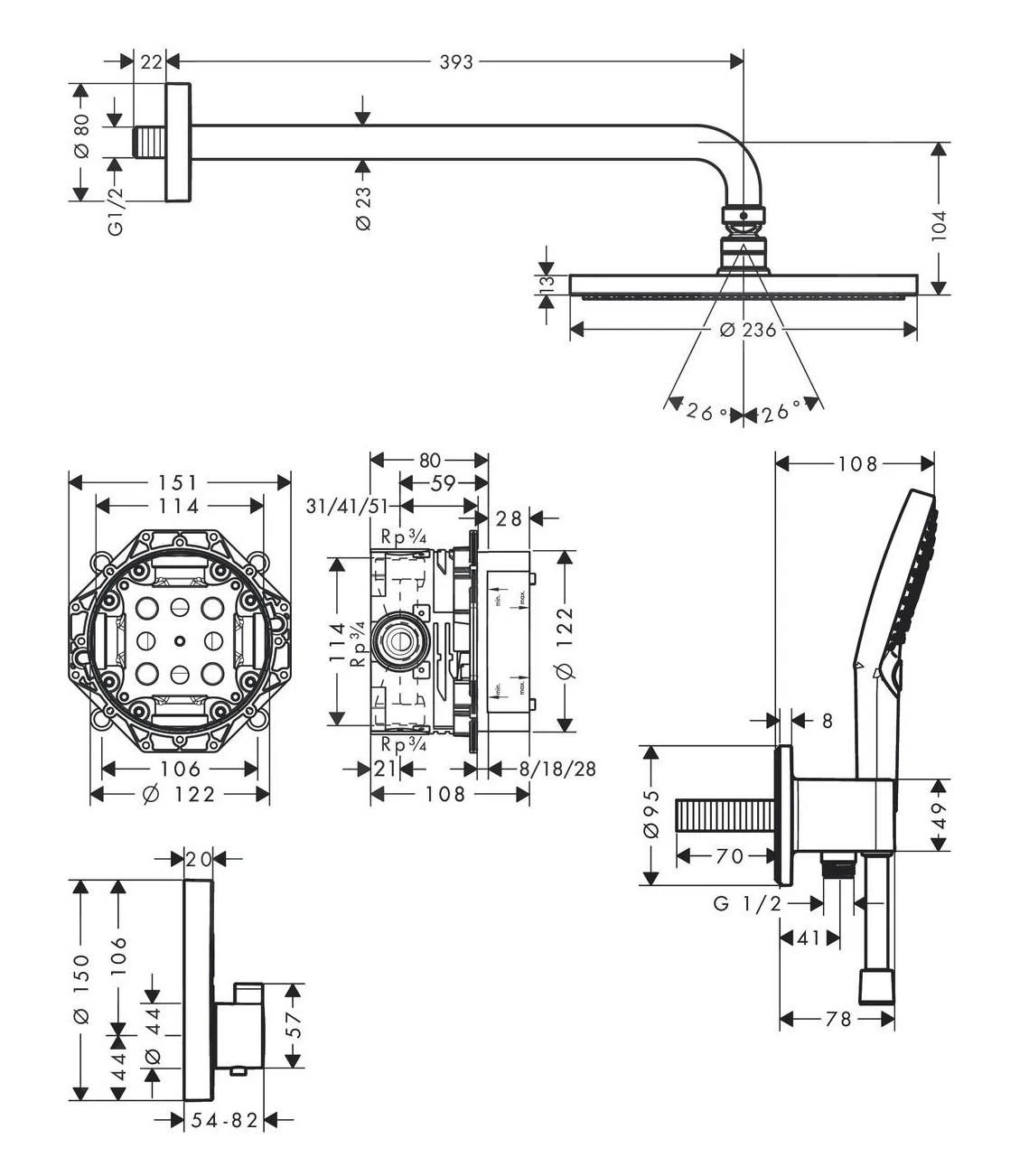 - adecuado para todos los conjuntos superiores de ducha, bañera y termostatos para instalaciones empotradas