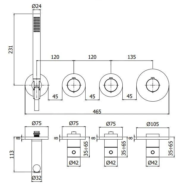 - diámetro de rosetas de pared 3×75 mm, 1×105 mm
